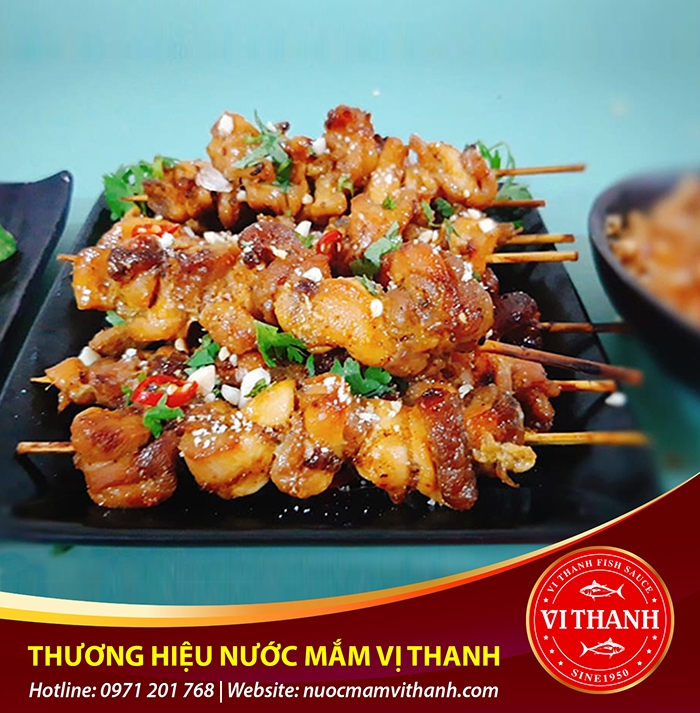 👉 Trình bày và thưởng thức: Xếp các xiên gà nướng ra mẹt (hoặc đĩa), rắc thêm rau mùi á»›t ăn kèm vá»›i nước sốt bÆ¡ Ä‘áºu phá»™ng. Món này ăn chÆ¡i hoặc ăn kèm vá»›i cÆ¡m trắng, xôi Ä‘á»u rất ngon.